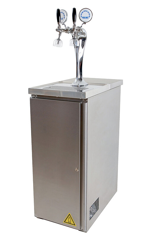 Das Filtersystem, die CO2- Gasversorgung und das Grundgerät werden in einen vorhandenen Schrank montiert. Darüber befindet sich die eingearbeitete Edelstahlabtropfwanne mit Ablauf, sowie die Schanksäule mit Kompensator Zapfhähnen.