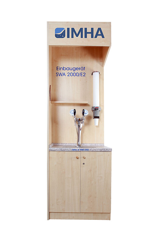 Das IMHA- Standgerät ist allseitig geschlossen und zur Aufstellung an der Wand oder frei im Raum vorgesehen. Alle Komponenten (Grundgerät, Filtersystem und CO2 Gasversorgung) befinden sich im abschließbaren Edelstahlschrank mit aufgesetzter 40 mm starken Edelstahlplatte. Auf dem Schrank ist die Abtropfwanne mit Ablauf eingearbeitet und die Zapfsäule mit Kompensator Zapfhähnen aufmontiert.