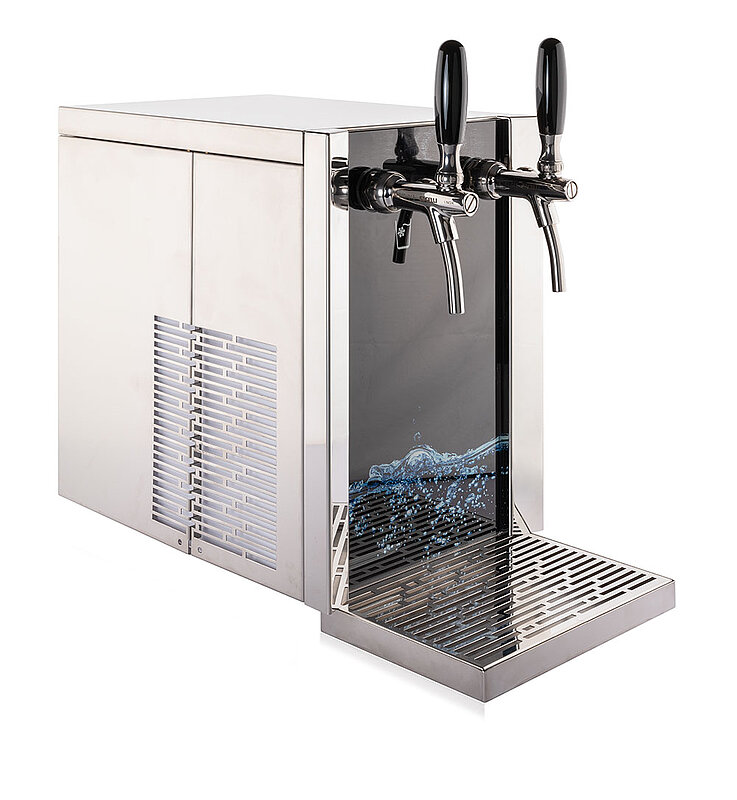 Das Grundgerät mit abschließbaren Edelstahlschrank wird unmittelbar hinter der Wand aufgestellt. Das Filtersystem, die Kühleinrichtung, der Karbonator, die CO2- Gasversorgung usw. sind im abschließbaren Edelstahlschrank hinter der Wand integriert. Hierzu erfolgt die Medienzuleitung durch die Wand.